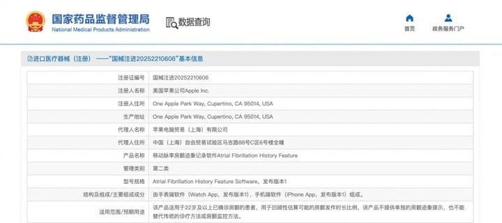 国行 Apple Watch 用户可以期待一下即将发布的 iOS 26.3 正式版。国家药品监督管理局官网公示,美国苹果公司的「移动脉率房颤迹象记录软件」已经在 2025 年 12 月 26 日完成医疗器械进口注册。