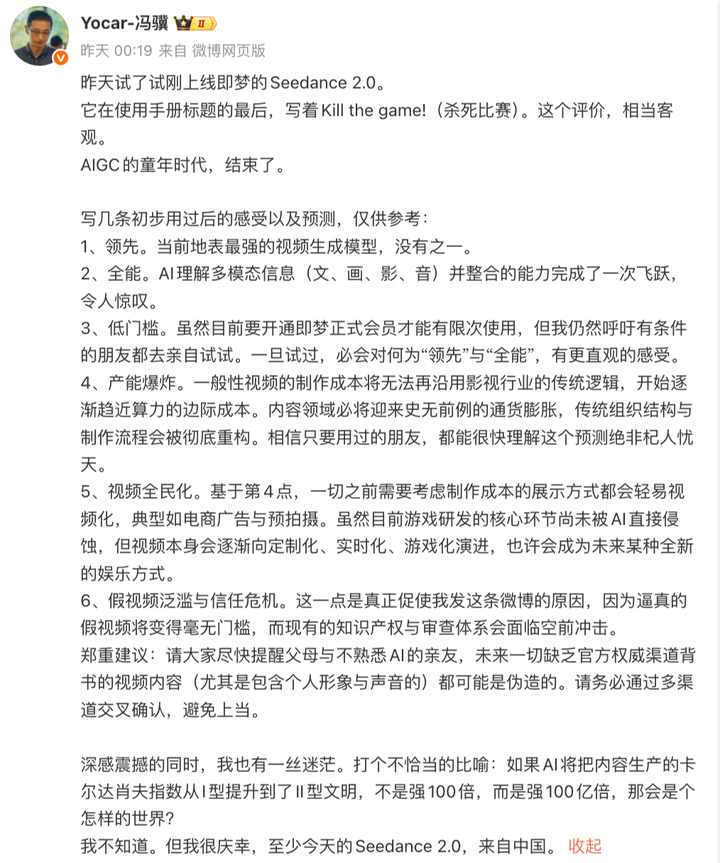 「来自中国的 Seedance 2.0 将成为最先进的技术。」