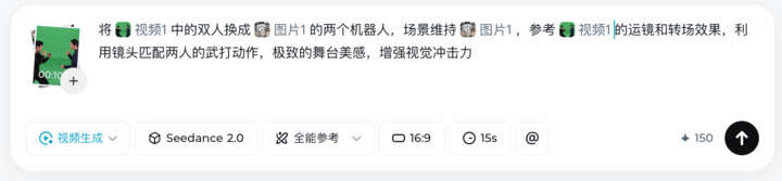 这里我们使用了 Seedance 2.0 使用手册内一段 10s 的打斗,然后告诉模型将视频中的两个人物动作,复制成我们上传的两个机器人。