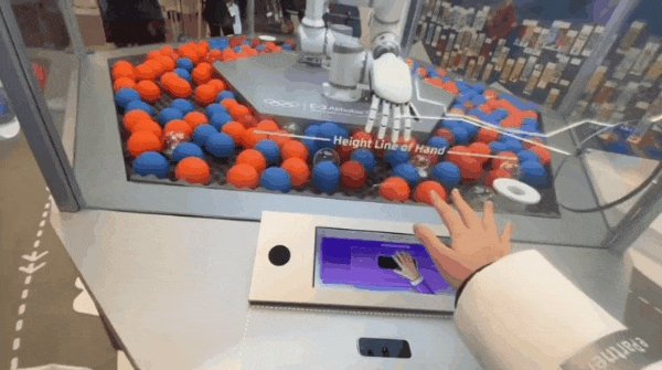 想体验一把「隔空取物」?那就站在屏幕前抬手,玻璃后的机械手会准确 copy 你的每一个手部动作,你指哪,它去哪;看准了,手一握,就伸入徽章球池给你捞一个新徽章球回来。