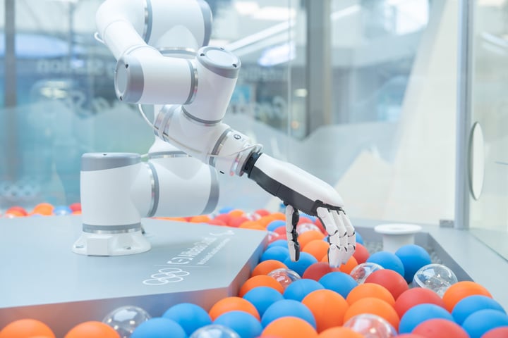 训练了一天累得不想动手?也行,直接用母语对 AI 下达指令,机器就会乖乖跑到你指定的区域抓取徽章球。
