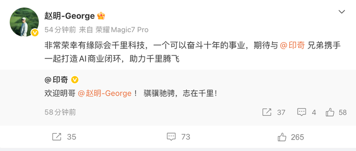赵明表示,「非常荣幸有缘际会千里科技,一个可以奋斗十年的事业,期待与印奇(千里科技董事长)兄弟携手一起打造 AI 商业闭环,助力千里腾飞。」印奇方面也表示,「欢迎赵明」。