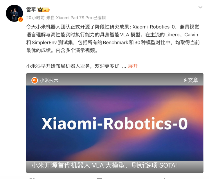 昨日,小米正式对外发布首代机器人 VLA 大模型 Xiaomi-Robotics-0。随后创办人雷军转发并表示「