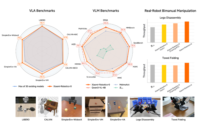 官方表示,Xiaomi-Robotics-0 不仅在三大主流的仿真测试中获得优异成绩,更在现实真机任务中实现了物理智能的泛化——动作连贯、反应灵敏,且能在消费级显卡上实现实时推理。