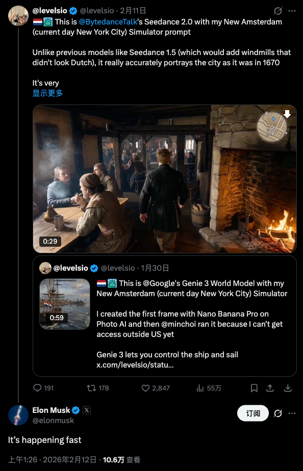 而在昨日,马斯克转发了一条由 Seedance 2.0 生成的视频内容,并感叹「发展得也太快了」(It’s happening fast)。