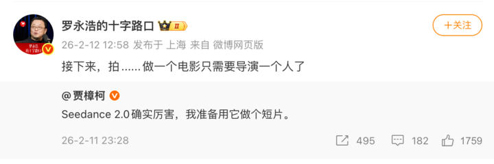 同在昨日,导演贾樟柯发文称「Seedance 2.0 确实厉害,我准备用它做个短片。」随后罗永浩转发并直呼「拍……做一个电影只需要导演一个人了」。