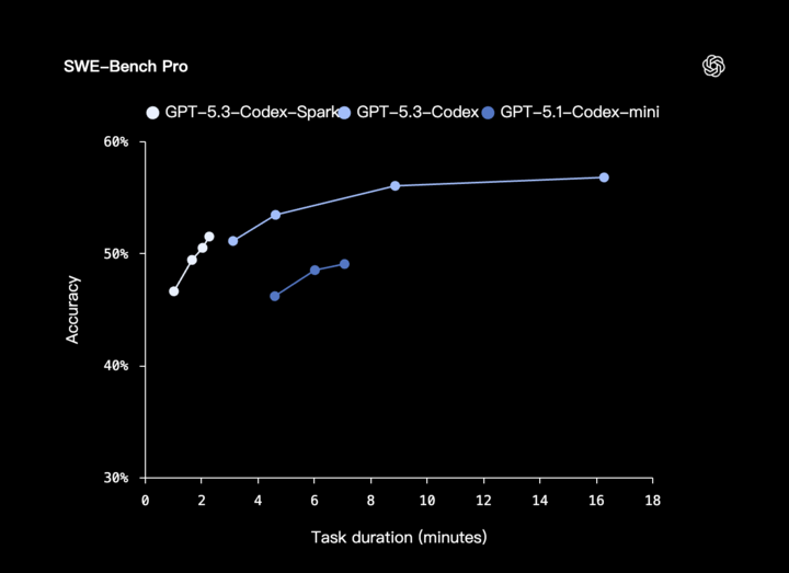 性能表现上,在 SWE-Bench Pro 基准测试中,Codex-Spark 在准确率上虽略低于完整的 GPT-5.3-Codex,但在任务耗时上大幅缩短(快数倍),且性能显著优于 GPT-5.1-Codex-mini。