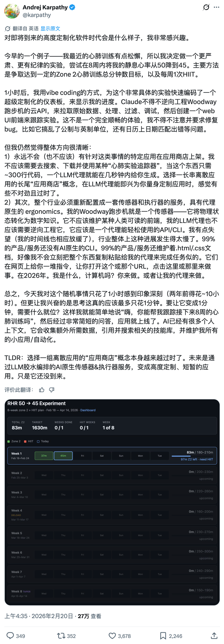 他想用 8 周时间把静息心率从 50 降到 45,计划是设定 Zone 2 有氧总时长目标,配合每周一次 HIIT。为了追踪进展,他花了 1 小时用 vibe coding 做了一个专属仪表盘。