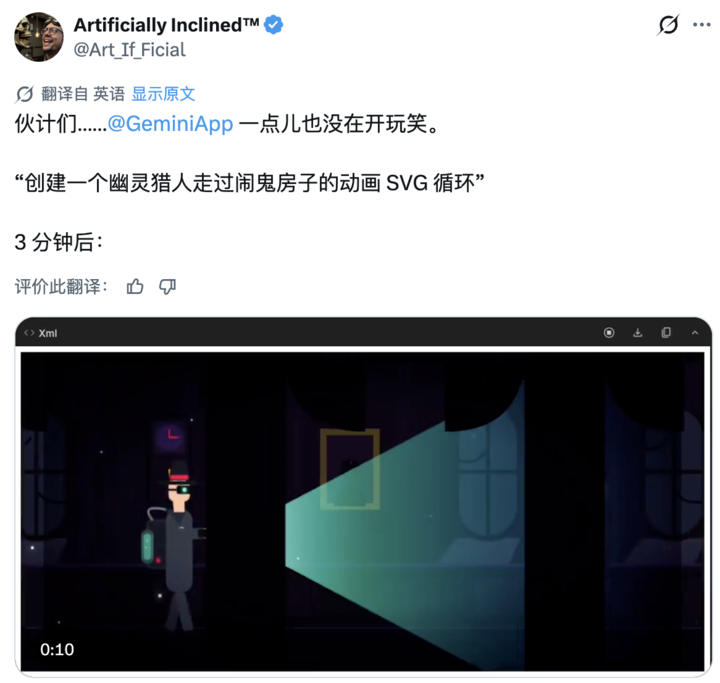 此外,网友们也贡献了不少精彩的案例。有人让 3.1 Pro 生成一个「鬼怪猎人穿越鬼屋」的动态 SVG 循环动画,结果直接看呆,评价是「Google 这次是认真的」。