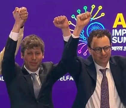 ▲OpenAI CEO 和 Anthropic CEO 在合影时拒绝握手,而是高举拳头。