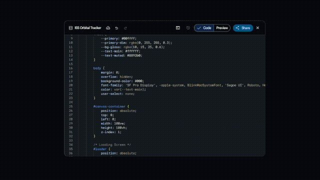 复杂系统方面,模型直接接入公开遥测数据流,搭出了一个实时追踪国际空间站轨道的航天仪表盘。