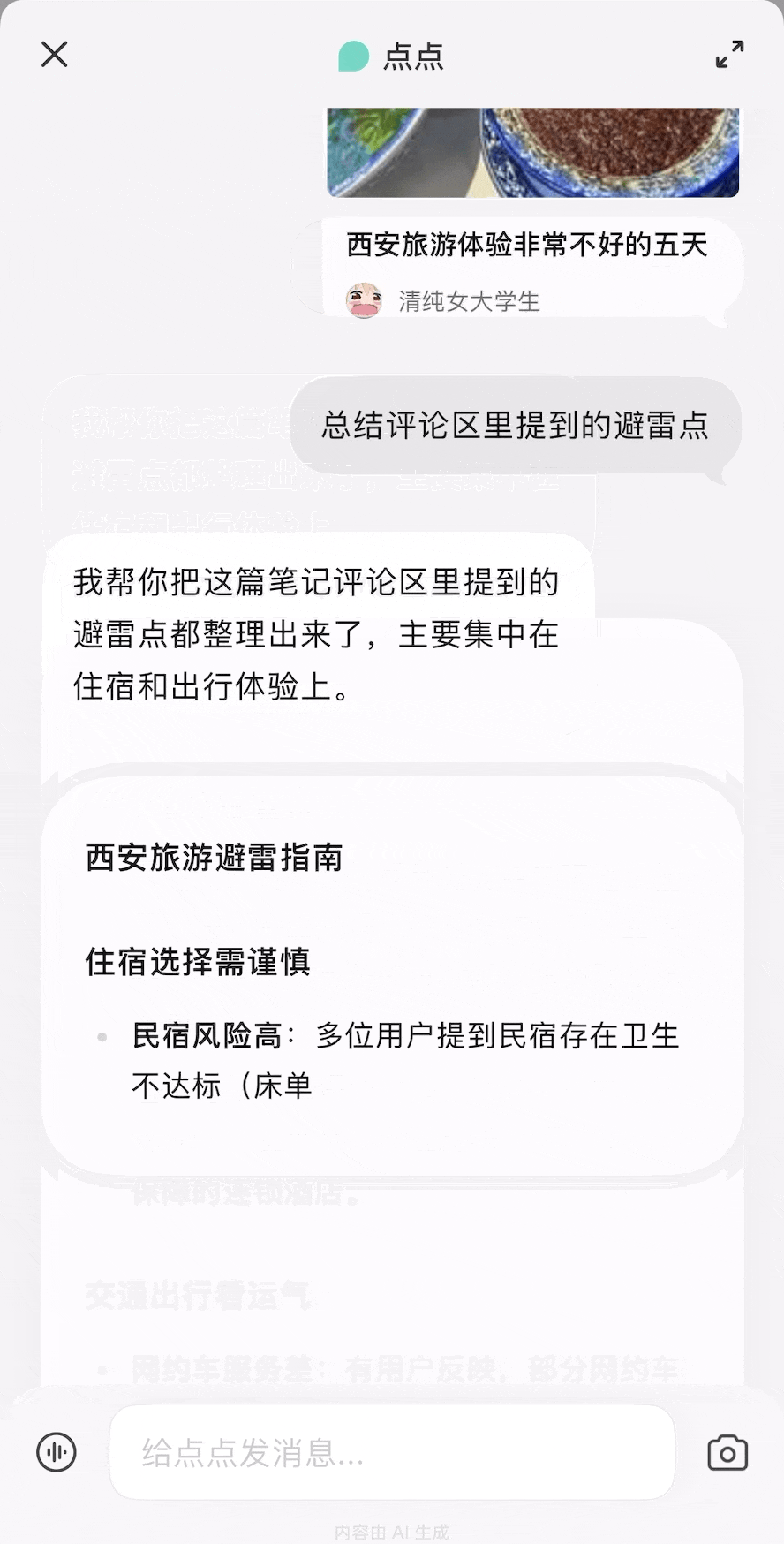 评论区是小红书最有价值、也最难处理的信息层:杂乱、充满缩写和梗,既有干货分享,又有情绪发泄——而这恰恰是点点的主场。在看到一篇标题为「西安旅游体验非常不好的五天」的笔记时,我让点点「总结评论区里提到的避雷点」。