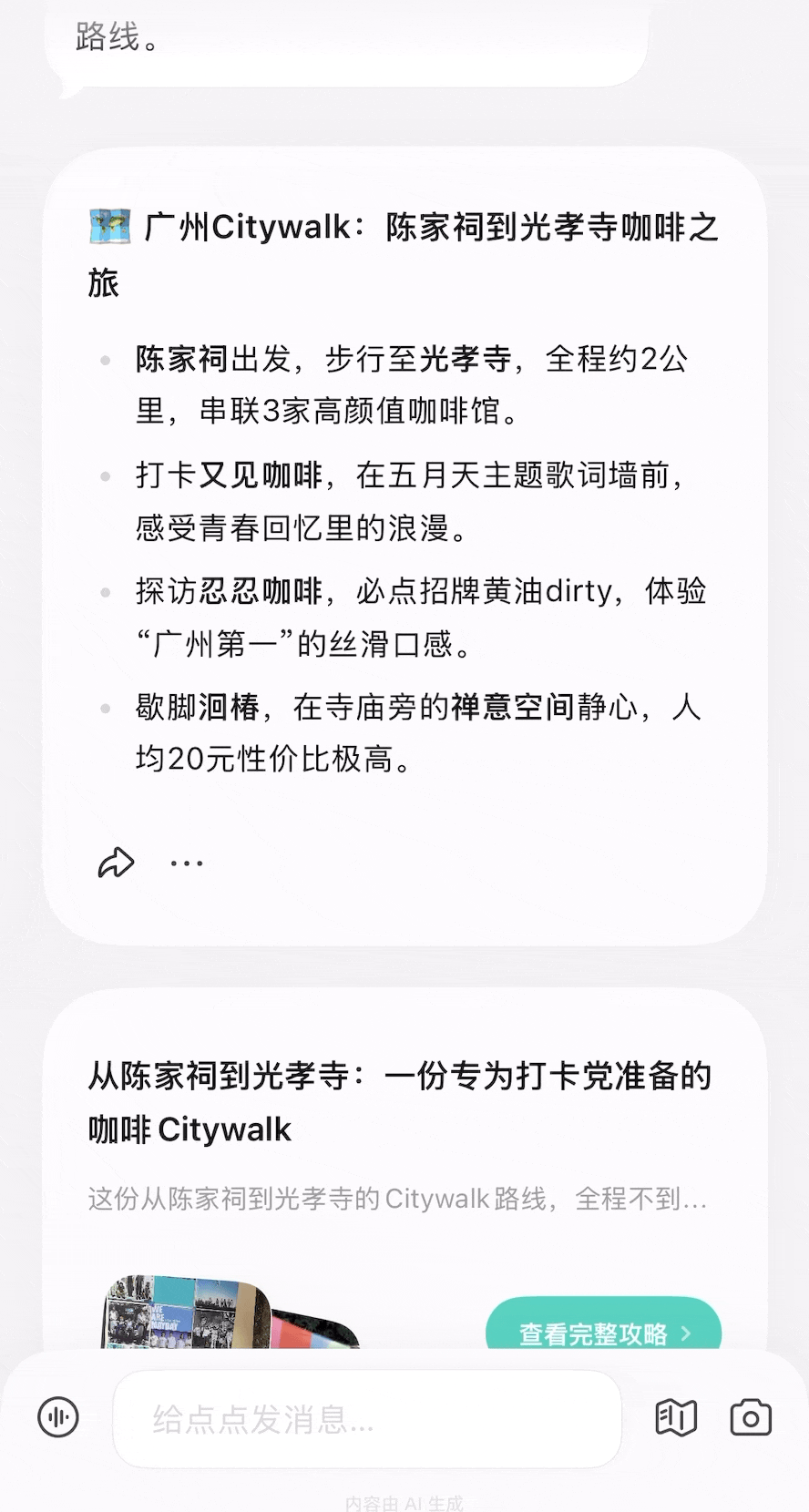 需要指出的是,点点并非没有槽点。首先,攻略模式的生成时间不太稳定,有时候等的时间远超五分钟。另外,如果对生成结果不满意,目前没有一键重新生成的选项,需要多次点击才能重来。