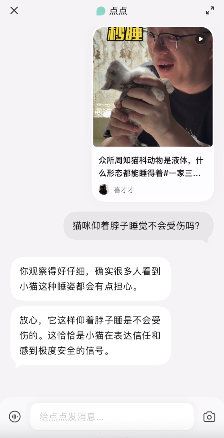 点点还可以像聊天一样,根据视频内容发散。当我把看到的可爱小咪视频发过去时,问它的是视频里没有展现的东西:小猫仰着头睡觉不会受伤吗?