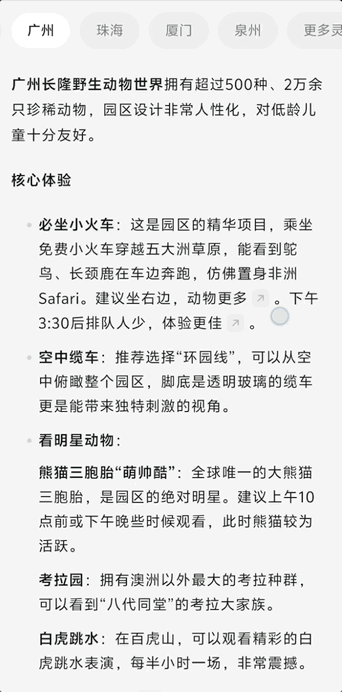 点点很快生成了一份详细的亲子出游攻略。从目的地选择,到每天的行程安排、亲子友好型餐厅和酒店建议,甚至连带娃出行的必备物品清单都列得清清楚楚。更贴心的是,它还会考虑到孩子的作息时间,把行程节奏控制得不紧不慢,避免大人小孩都累得够呛。