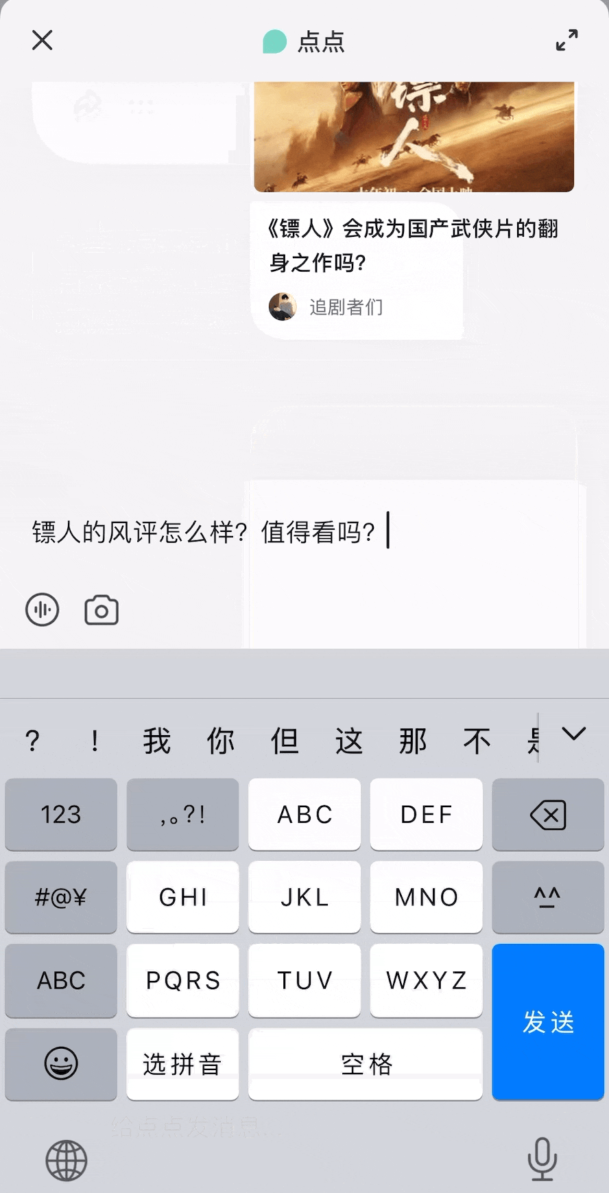 点点在这里承担的角色,就是通读全篇,压缩内容,提取核心。随机刷到电影推荐时,我先是发给了点点问,「《镖人》的风评怎么样?值得看吗?」。