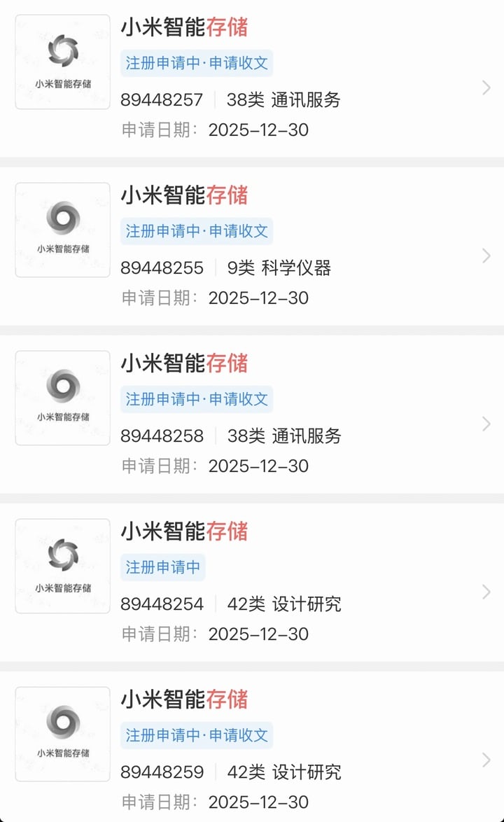 企查查信息显示,近期,小米科技有限责任公司已向相关部门提交多枚「小米智能存储」商标注册申请,分类覆盖科学仪器、通讯服务及网站服务等领域,商标状态目前均处于注册申请或等待实质审查阶段。