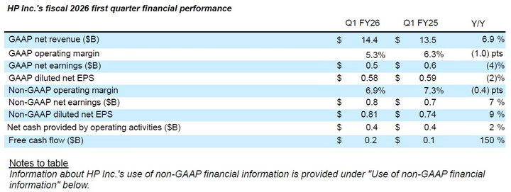 今天,惠普公布了今年第一财季(截至 2026 年 1 月)财报,营收与非 GAAP 每股收益均高于市场预期,多项关键业务指标实现同比增长。