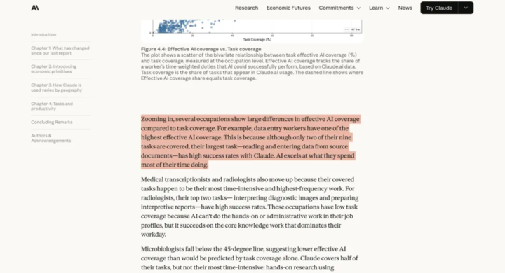 数据录入员和数据库架构师在这个维度上排名靠前。前者虽然只有两项核心任务落在 Claude 的能力范围内,但其中一项恰好是他们花时间最多的工作——从源文档读取并录入数据。
