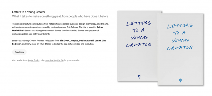 这个文集的名称也颇有巧思——致敬德国诗人里尔克《给一个年轻诗人的信》,这也是乔布斯生前最喜欢的读物之一。