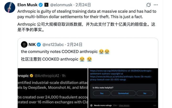 Musk 在 X 上也补了一刀:「Anthropic 大规模窃取训练数据,还为此支付了数十亿美元的和解金。这是事实。」
