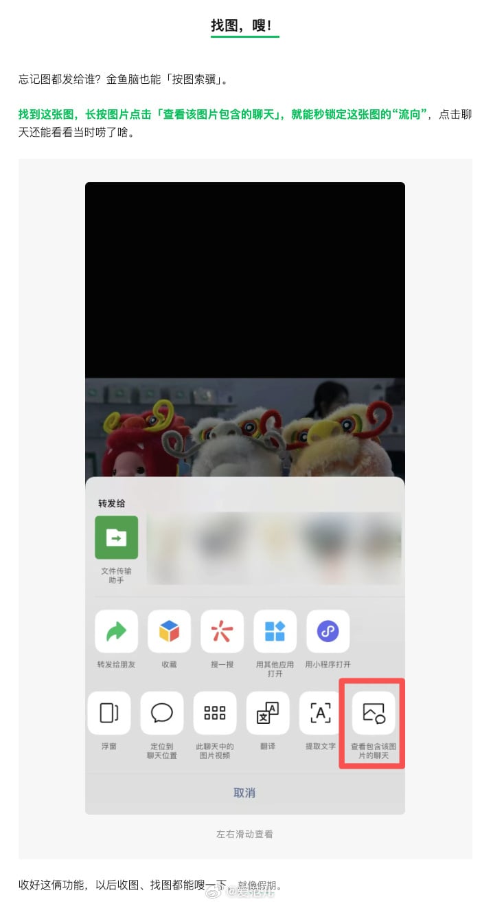 用户只需长按聊天中的图片,点击「查看该图片包含的聊天」,即可精准锁定这张图的「流向」,查看它在哪些单聊或群聊中使用过。