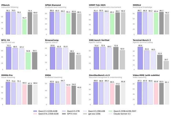 - Qwen3.5-35B-A3B 的表现已超越前代更大规模模型 Qwen3-235B-A22B-2507 及 Qwen3-VL-235B-A22B;