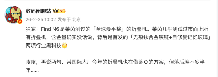 该博主还透露,「某国际大厂今年的折叠机也在借鉴 OPPO 的方案,但落后差不多半年」。