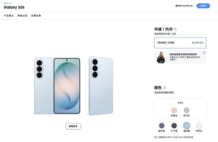 根据三星官网,标准版 S26 国行仅提供 12+256GB 一种配置,价格相比去年上涨 1000,来到了 6999 元起: