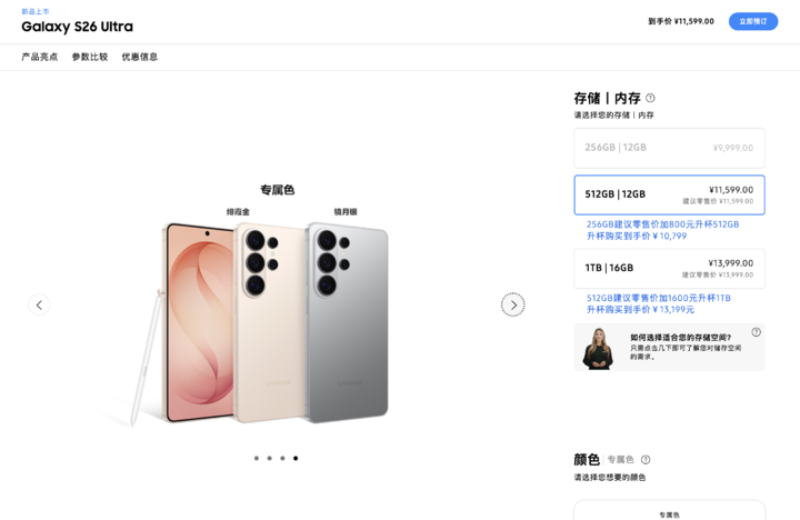 大屏的 S26+ 则有 12+256 和 12+512GB 两种可选,标价分别为 7999 和 9599,曾经的免费升杯也变成了「加 800 元升杯」,512 机型实际到手价为 8799 元: