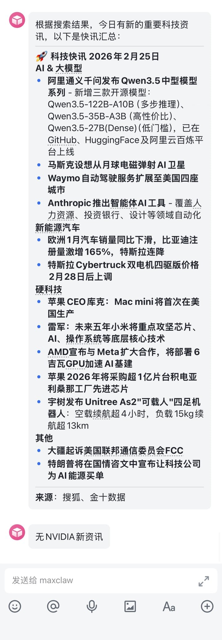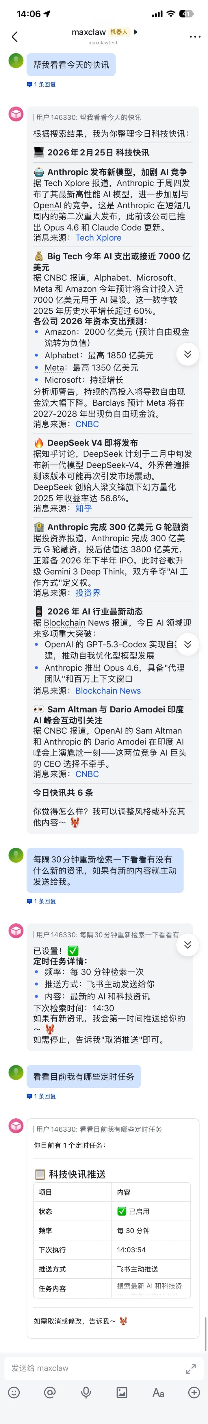 时间一到,MaxClaw 在飞书里,准时给我们推送了最新的资讯。