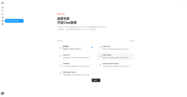 拿部署到飞书机器人举例,甚至不用额外的部署指南,我们只需要点开首页左侧边栏的 MaxClaw 按钮,点击「立即开始」,我们可以选择使用默认配置,或者其他专家。