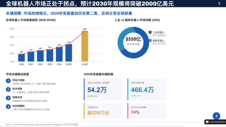 实际测试中,我们只输入了一句非常简单的需求,「制作一份关于全球机器人市场的10页幻灯片演示文稿」。但最终生成的 PPT,在信息密度、结构完整度和图表配置上都没有明显缩水,基本具备拿来就能用的初稿质量。