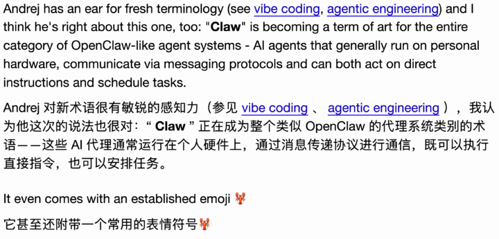 ▲知名博主 Simon Willison 提到 Claw 似乎正在成为像 Agent 一样的专用术语,用来描述一种新的智能体类别|图片来源:https://simonwillison.net/2026/Feb/21/