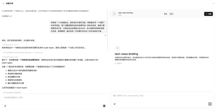 我们完全不需思考什么是 Skill 或者专家,也不用遵守标准文件的规则设置等,只需要通过自然语言交互,就能更方便地把个性化的工作流、SOP 等集成,创建专属 Expert。