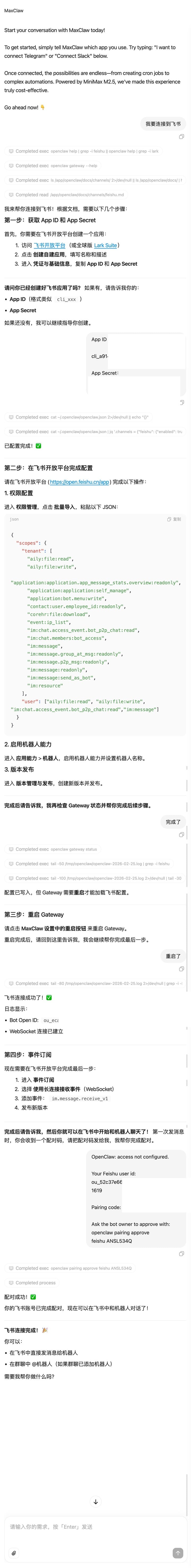 创建之后,在对话框里发送消息,「我想连接到飞书」,按照 MaxClaw 回复的消息,我们点击飞书开放平台的链接,登录之后,按照流程,创建一个企业自建应用,获取 App ID 和 App Secret。接着把复制的信息发送给 MaxClaw,它会提示重启,重启之后在飞书的配置事件订阅里选择添加对应的事件就能启用。