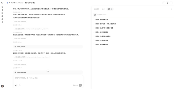 还没听说过有能生成视频的通用 Agent 产品,但现在结合多个不同的 Skills、Agents 的专家,输入一段剧情,直接就能给我们一部短剧。