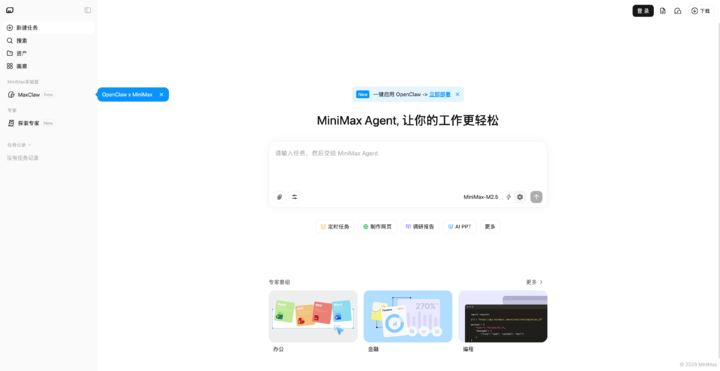 MiniMax Agent 新增的 MaxClaw 模式,一键打通了 OpenClaw 生态,不需要繁琐的手动部署和配置模型 API,通过MiniMax Agent 网页端就可以快速上手。