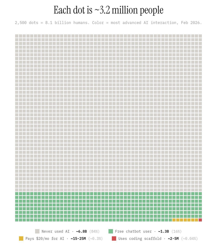 ▲全球 81 亿人中, 84% 的人从未用过 AI,而只有 0.3% 的用户愿意为 AI 付费|图片来源:https://global-ai-adoption.netlify.app/