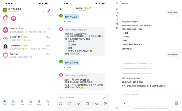 顺利部署之后,我们在自己的飞书里,就能看到一个对应名字的机器人,然后直接开启对话,所有的对话也会同步在 MiniMax Agent 网页里的 MaxClaw 显示。
