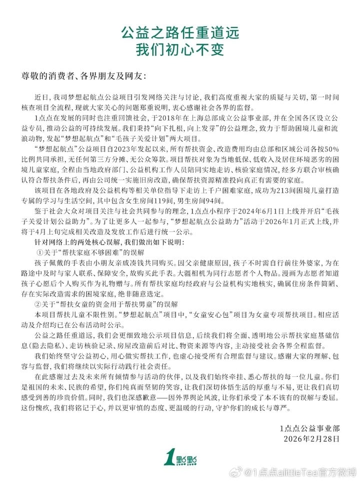 昨天,奶茶品牌「1 点点」就其「梦想起航点」公益项目引发的多项网络争议发布声明,回应外界对受助家庭条件、物资来源及项目透明度的质疑。