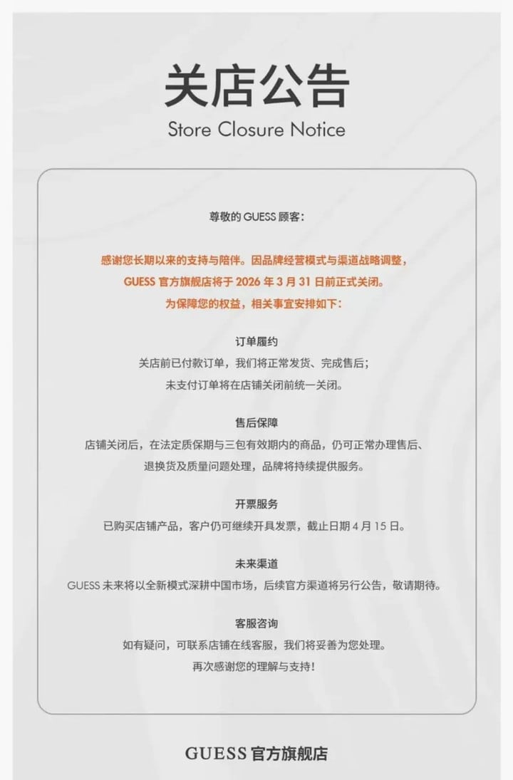 尽管关闭直销渠道,GUESS 在短信中强调「并非退出中国市场」,而是将以全新模式继续深耕。