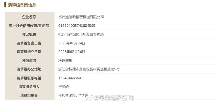 据每日经济新闻报道,近日,有接近杭州娃哈哈精密机械有限公司人士透露,娃哈哈精机于 2026 年 2 月 24 日发布解散公示,现已依法进入解散程序。