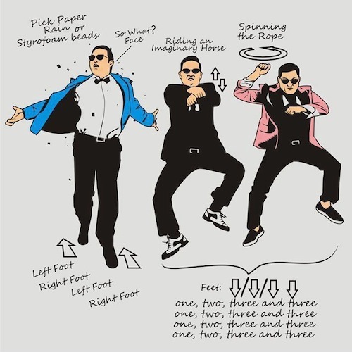 不过,《江南 Style》比起《最炫民族风》多了舞蹈元素。舞姿,作为一种肢体语言,能够带动人的情绪,让人想随之舞动。芭蕾舞过于复杂了,如果要跳这种舞,不经过经年累月的专业训练无法做到。而“骑马舞”只是几个简单动作的组合,学会它并不难,一张图片足以说明白: