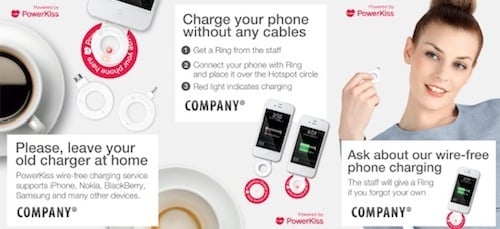 离开办公室,到咖啡厅、快餐店、机场候机厅、酒廊、大堂等,无线充电更可以成为商家提高消费者体验和黏性的一个独特卖点,就如同 Wi-Fi 当年一样。芬兰一家名为 PowerKiss 的公司提供一整套无线充电解决方案。面向消费者,PowerKiss 销售一种名为“The Ring”的外挂式无线充电设备,能够兼容包括 iPhone、诺基亚、黑莓、三星在内的大多数主流智能手机。