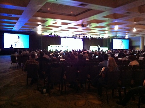 DEMO 的会场很宽敞,感觉把 Hyatt Regency 一层的大部分空间都利用起来了。除了可以容纳近千人的主会场,还有一个差不多大小的房间用于集中摆放参赛项目的展位,另外还有宽敞的媒体间和自助餐厅。特别值得一提的是,有一个露天带游泳池的活动场所,被用于会议开始前一天晚上的参会者接待和欢迎聚会,以及第二天晚上的参会者交流酒会。在对创业项目和创意应接不暇之余,在星空下和泳池边喝着小酒,听着音乐,很是惬意和享受。