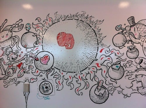 Facebook 公司的墙上,也随处可见 hacker 们的随意涂鸦。访客们也被允许在几面墙上随意涂画,这些墙面上可以看到众多国家的文字符号,类似“到此一游”、“小芳我爱你”之类的多语种留言不一而足。