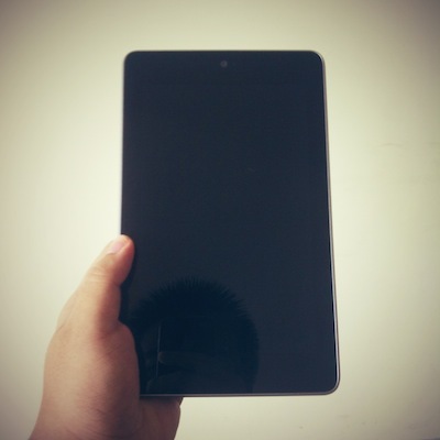最近向朋友借了 Nexus 7 把玩,发现它的宽度刚好一只手能够把握,而且重量很轻,无论是站着、坐着、趴着、卧着,都可以找到合适的卧姿以及角度,方便操作。