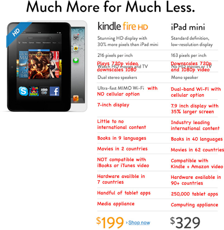 从图上可以看出,iPad mini 并非像 Amazon 所强调那般“无力”。至少,屏幕面积要大 35%,而且有 3G 版的可供选择。此外,Amazon 的书籍、电影仅支持少数几个国家的劣势被提了出来。