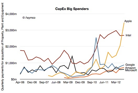 换言之,苹果第四季度的开支,相当于英特尔一个季度在工厂方面的投入,加上 Google 在服务器方面的投入。